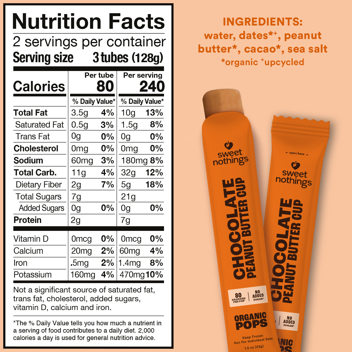 Our Chocolate Peanut Butter Cup Dessert Pops flavor is a delicious combination of organic, real ingredients! These Dessert Pops come in six pre-blended 1.5 oz. tubes of all-natural nutrition with zero added sugar. They are naturally sweet and perfectly portable.