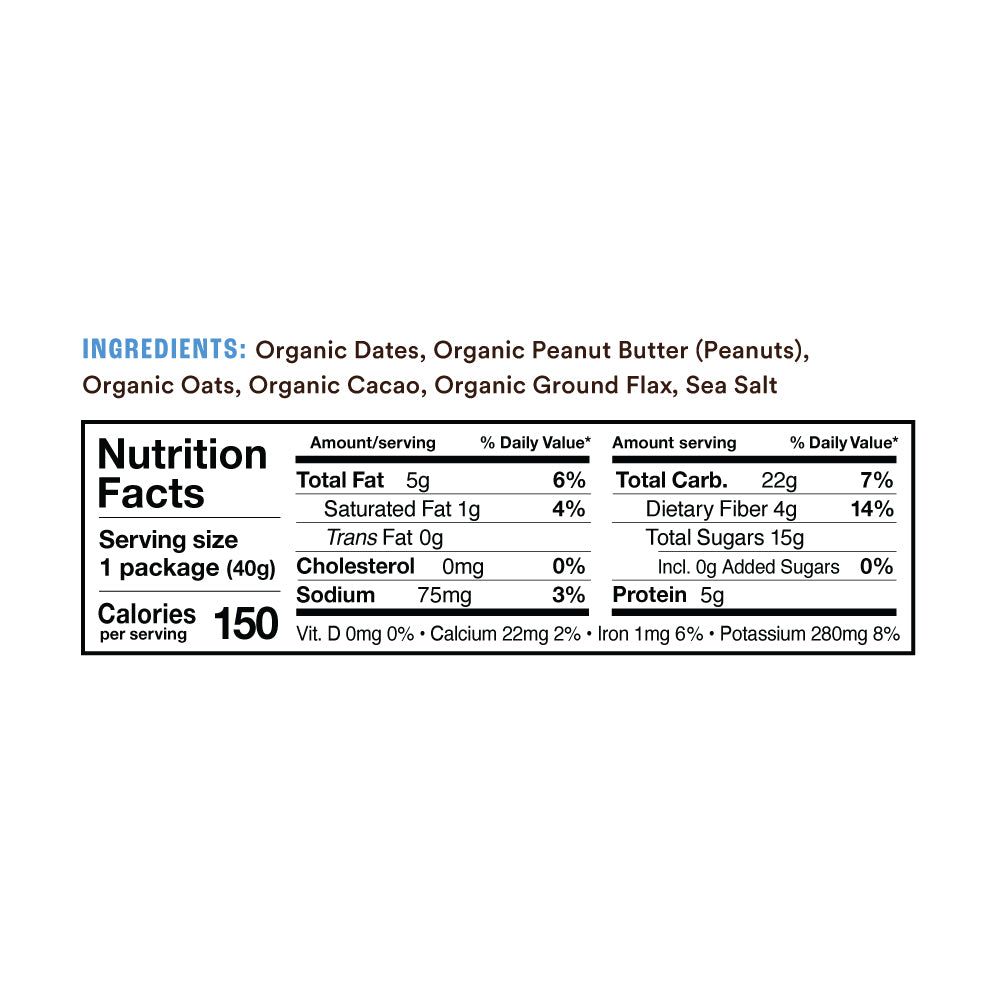 A convenient nut butter snack that’s perfect for your nutty schedule? Yes, please! These wholesome and delicious Superfood Nut Butter Bites are made with a chewy outer shell of organic cacao, oats, dates, and flaxseed and filled with an inner center of creamy organic peanut butter. They’re a delicious, healthy on-the-go snack that is sure to be a staple in your pantry. Just like everything we make, these nut butter bites are plant-based and have no added sugar. We only use simple, organic ingredients you can feel good about eating.