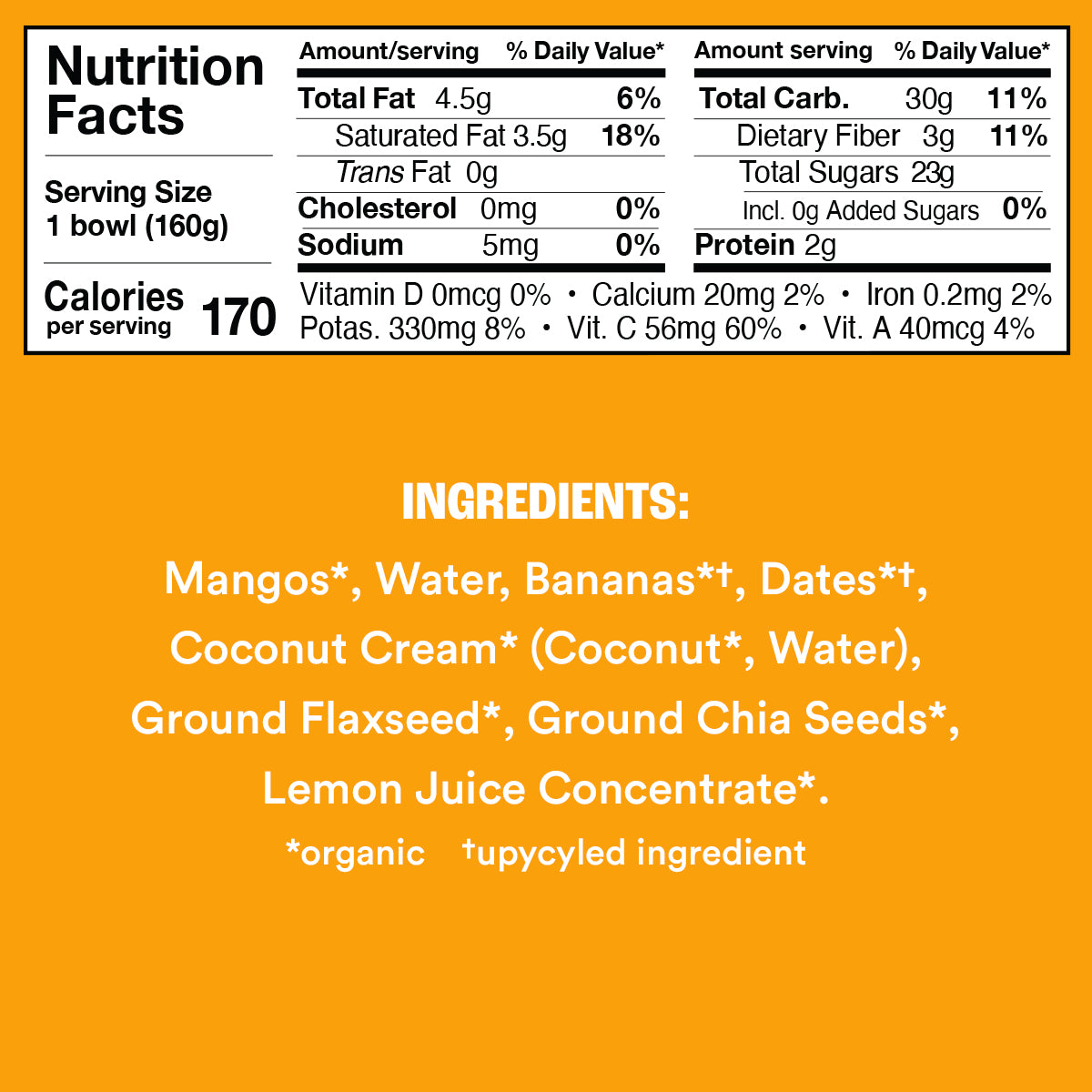 Introducing our Mango Smoothie Bowl! A taste of the tropics with nutrients to keep you going strong. Juicy mango, bananas, dates, and chia seeds come together for a smooth, sunny flavor that supports immunity and delivers 60% of your daily Vitamin C. With no added sugar, refined sweeteners, dairy, or gums, it’s a wholesome way to start your morning, refuel mid-day, or recover after a workout. Clean, organic ingredients make every spoonful feel as good as it tastes.